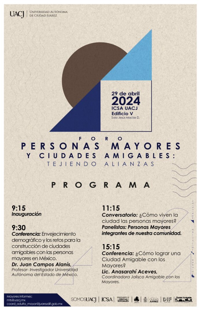 El Sistema para el Desarrollo Integral de la Familia del Municipio de Juárez (DIF) a través de la Coordinación para la Atención a las Personas Mayores y en coordinación con el Departamento de Ciencias sociales y Trabajo Social de la Universidad Autónoma de Ciudad Juárez (UACJ), llevará a cabo el próximo 29 de abril el foro Personas Mayores y Ciudades Amigables: Tejiendo Alianzas.