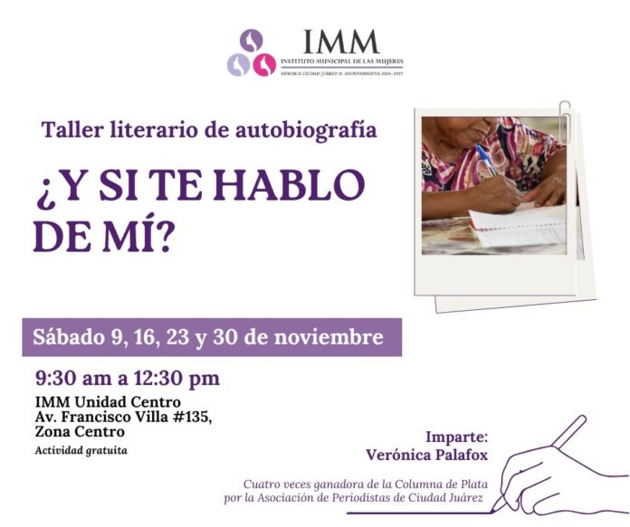 El Instituto Municipal de las Mujeres de Ciudad Juárez (IMM) invita a participar en el taller de literatura autobiográfica “¿Y si te hablo de mí?”, impartido por la comunicadora y guionista Verónica Palafox, dirigido a mujeres mayores de 18 años.