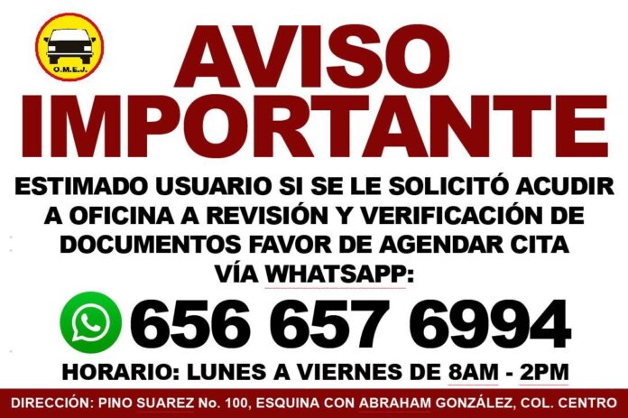 Para aquellos dueños que tengan faltantes de documentos, deberán agendar una cita vía WhatsApp al número: 656 657 6994 y serán atendidos en un horario de lunes a viernes de 8 de la mañana a 2 de la tarde.