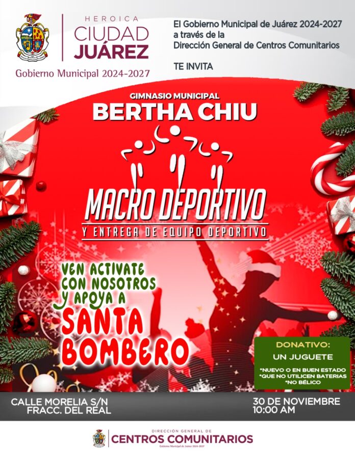 El Gobierno Municipal 2024-2027, a través de la Dirección General de Centros Comunitarios, invita a la comunidad fronteriza al evento Macro Deportivo y Entrega de Equipo Deportivo, que tiene entre sus objetivos apoyar la campaña del Santa Bombero.