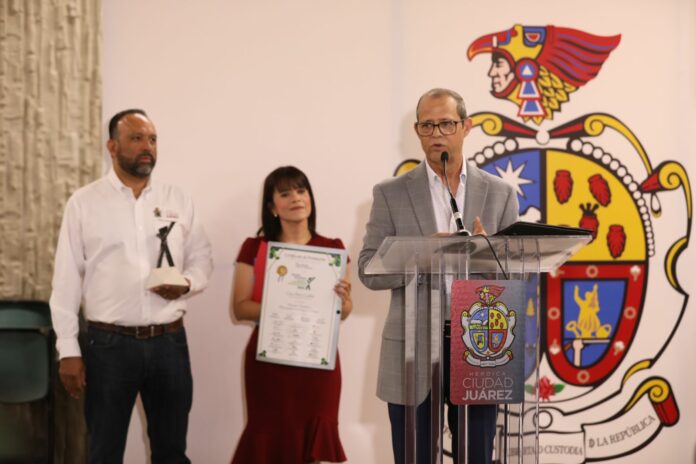 Ciudad Juárez, Chih .- Enrique Licón, director de Administración y Control de Proyectos, expresó “estamos muy contentos de estar presentes en la entrega de este importante reconocimiento que se le dio a Cruz Pérez Cuéllar como presidente municipal de Ciudad Juárez, en donde el premio que se otorga es un galardón temático en planeación estratégica urbana, el proyecto es Visión Juárez 2040”.