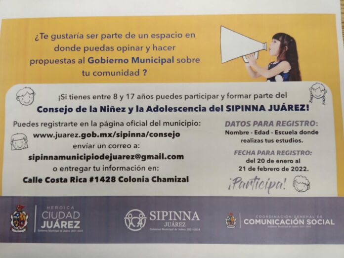 Los menores interesados en participar pueden registrarse en la página oficial del municipio www.juarez.gob.mx/sipinna/consejo, o enviar un correo electrónico a [email protected], o bien entregar la información en la calle Costa Rica 1428, de la colonia Chamizal.