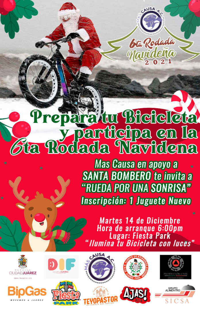 Ciudad Juárez, Chih .- La asociación Más Causa, ha organizado este evento para que la comunidad ciclista de la ciudad también sea parte de esta colecta de juguetes que pretende hacer felices a muchos niños y niñas el próximo 24 de diciembre, por lo que la inscripción consta en un juguete nuevo y se sugiere adornar las bicicletas con luces.