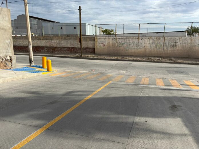 Ciudad Juárez, Chih .- La obra constó de la pavimentación de las vialidades con concreto hidráulico, garantizando la durabilidad de las mismas, además de la introducción hidrosanitaria, banquetas, guarniciones, alumbrado público, así como pintura en lineamientos de tráfico.