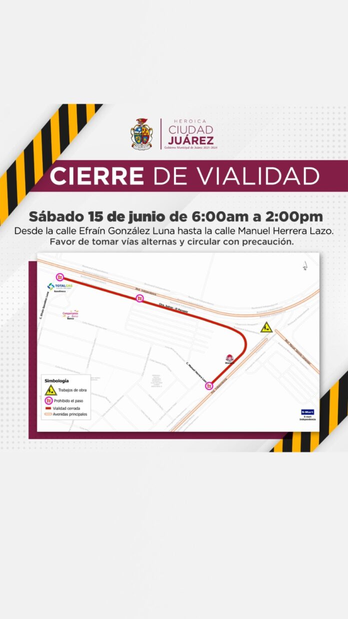 Ciudad Juárez, Chih .- Debido a lo anterior, es que se cerrará la circulación desde la calle Efraín González Luna hasta la calle Manuel Herrera Lazo en un horario de 6:00 de la mañana a 2:00 de la tarde mañana sábado 15 de junio, por lo que se recomienda tomar la desviación hacia el sur sobre la calle Efraín González Luna para luego tomar la calle Adolfo Ibarrola hacia el oriente y posteriormente incorporarse a Talamás Camandari para continuar con el trayecto.