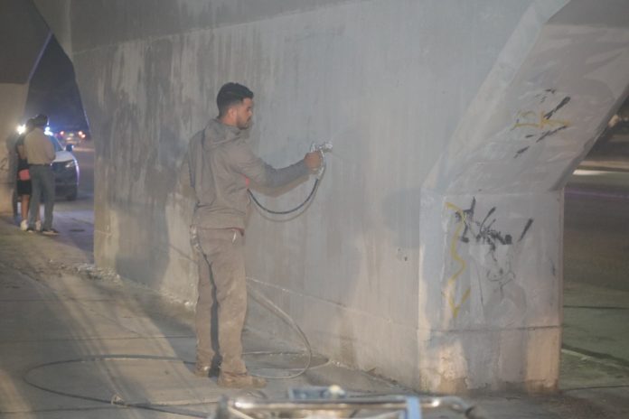 Ciudad Juárez, Chih .- En esta actividad, que se desarrolló la noche del miércoles como parte de la Cruzada Nocturna que lleva a cabo la Dirección General de Servicios Públicos, se pintaron los murales y pilares del puente que se encuentra en la avenida Tecnológico y Ejercito Nacional, conocido como Puente del Trebol.