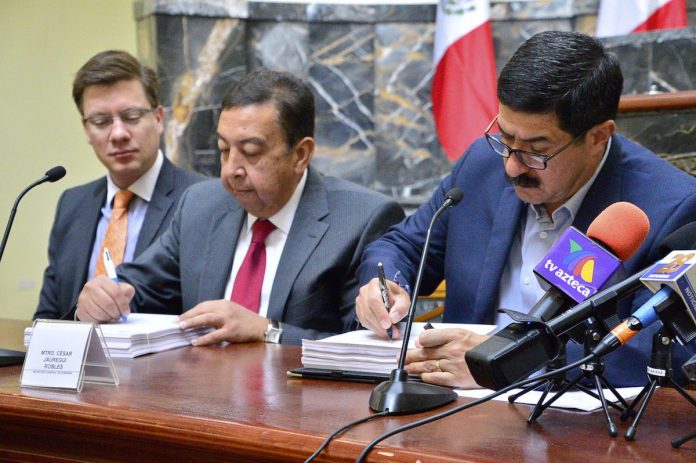 La Iniciativa de Decreto fue firmada ante los medios de comunicación por el gobernador y por el secretario General de Gobierno, César Jáuregui Robles y después de la presentación pública realizada en Palacio de Gobierno, correspondió a Jáuregui acudir al Poder Legislativo y entregar el documento a la presidenta del Congreso del Estado, Karina Velázquez.
