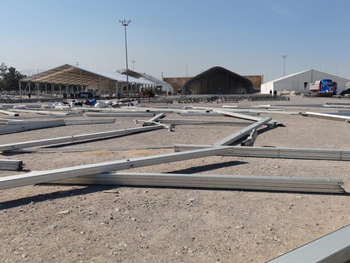 Ciudad Juárez, Chih (ADN/Arturo Hernández) – El avance de un 80 por ciento presenta el albergue que el gobierno federal instala en El Punto, y se espera que para el lunes quede concluido para recibir a los connacionales que sean deportados de los Estados Unidos.
