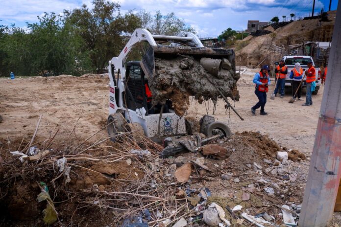 Ciudad Juárez, Chih .- En atención a las instrucciones giradas por la Gobernadora del Estado, Maru Campos, y del director ejecutivo de la J+, Sergio Nevárez Rodríguez, se realizan estos trabajos con el objetivo de proteger a la población ante los riesgos provocados por las lluvias. Desde hace más de seis años no se le daba mantenimiento a este dique, aseguraron los vecinos de la zona.