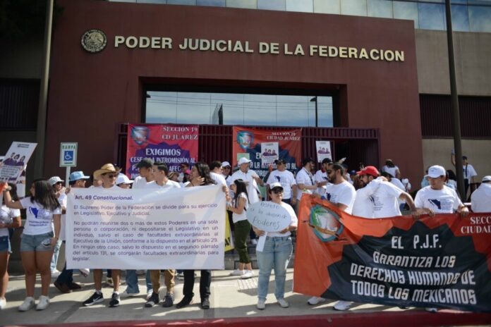 Ciudad Juárez, Chih (ADN/Arturo Hernández) .– Alrededor de 60 miembros de Ciudadanos Unidos por la Democracia, se colocaron frente a las oficinas del Poder Judicial, en Ciudad Juárez, en protesta por la elección de jueces y magistrados que se desarrolla en todo el país.