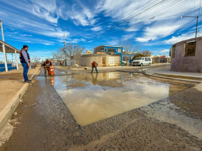 Ciudad Juárez, Chih. (ADN/Staff) – La Junta Municipal de Agua y Saneamiento (JMAS) de Juárez llevó a cabo trabajos de limpieza y bacheo en el fraccionamiento Parajes de San José, para atender afectaciones derivadas de las recientes lluvias y brotes de drenaje en la zona.