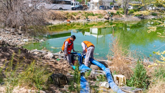 Ciudad Juárez, Chih. (ADN/Staff) – La Junta Municipal de Agua y Saneamiento (JMAS) de Juárez lleva a cabo trabajos de limpieza y mantenimiento en el dique ubicado en el cruce de las calles Soja y Aira, en la colonia El Mezquital, tras solicitudes de habitantes del sector.