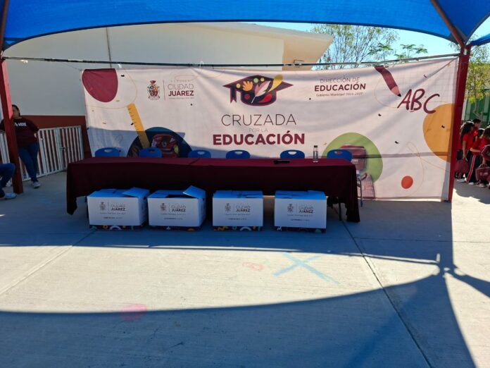 Ciudad Juárez, Chih .- Siguiendo las instrucciones del Presidente Municipal, Cruz Pérez Cuéllar, de sumarse a la Cruzada por la Educación, integrantes de salud acudieron a las escuelas Graciela Hierro, Arturo Rosenblueth, María Izquierdo, Carlos Monsivais e Ismael Landeros Viezcas para entregar a los estudiantes los útiles escolares.