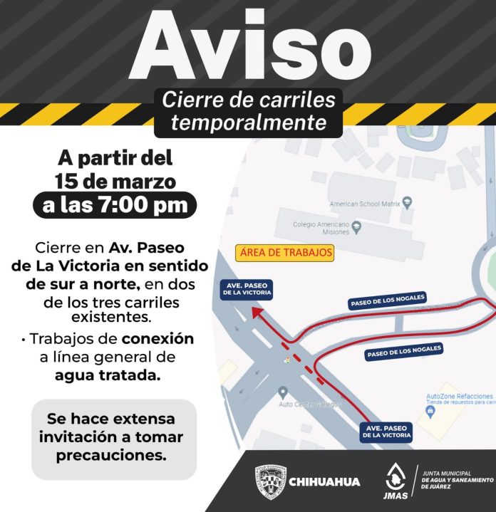 Ciudad Juárez, Chih .- El cierre se llevará a cabo a partir de las 7:00 de la tarde, casi a la altura de la calle Morelia, se obstruirán dos carriles en sentido de sur a norte, se pide a los automovilistas tomar vías alternas, o circular por la zona con precaución.