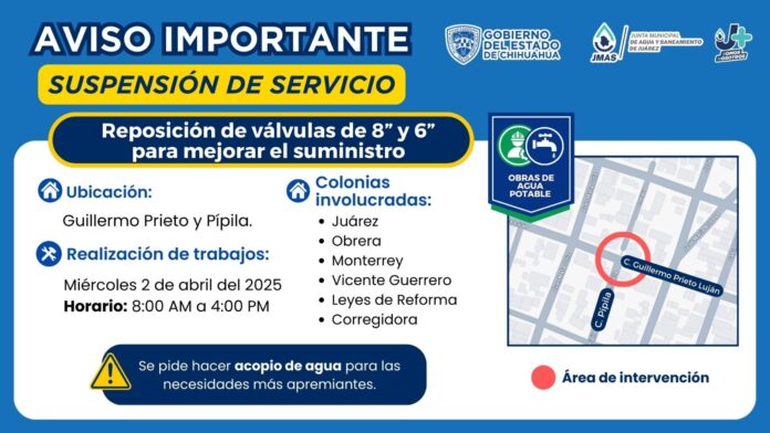 Los trabajos los llevará a cabo el Departamento de Agua Potable de la Junta de Agua y Saneamiento de Juárez y se realizarán mañana miércoles, entre las 8:00 y las 16:00 horas en el cruce antes mencionado, motivo por el cual se impactará la prestación del servicio en las colonias Juárez, Obrera, Monterrey, Vicente Guerrero, Leyes de Reforma y Corregidora.