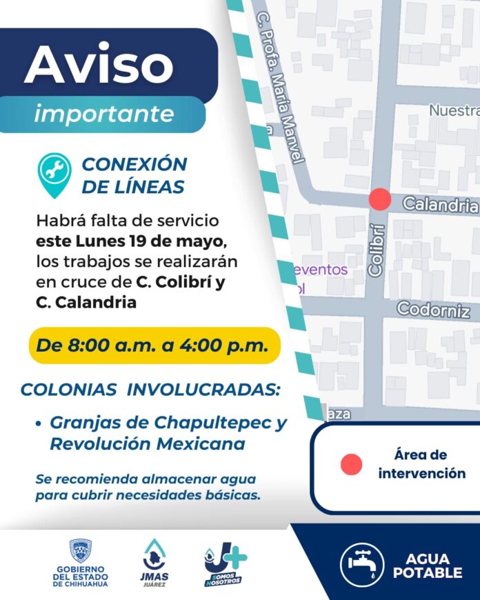 Ciudad Juárez, Chih .- Será en el cruce de las calles Colibrí y Calandria, donde el Distrito I de Agua Potable de la Junta de Agua y Saneamiento de Juárez realizará la conexión de una línea de 6 pulgadas con una de 3 pulgadas.