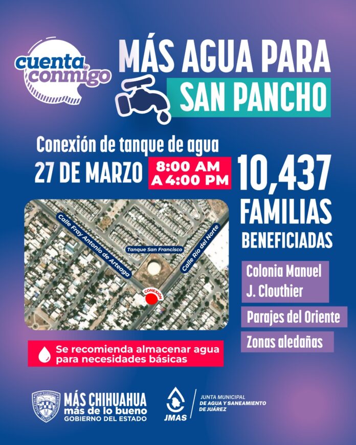 Ciudad Juárez, Chih. (ADN/Staff) – La Junta Municipal de Agua y Saneamiento (JMAS) realizará trabajos de interconexión de una línea de conducción para fortalecer el suministro en la zona de San Pancho, como parte de acciones preventivas ante el incremento en la demanda durante la temporada de calor.