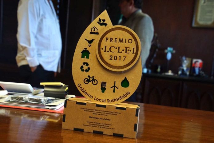 Ciudad Juárez, Chih. – La tarde del Lunes 4 de diciembre, el Presidente Municipal Armando Cabada Alvídrez, recibió en su despacho el premio que le fue otorgado al Municipio de Juárez por ser un Gobierno Resiliente, emitido por el Secretariado para México, Centroamérica y el Caribe de los Gobiernos Locales por la Sustentabilidad (ICLEI, por sus siglas en inglés).