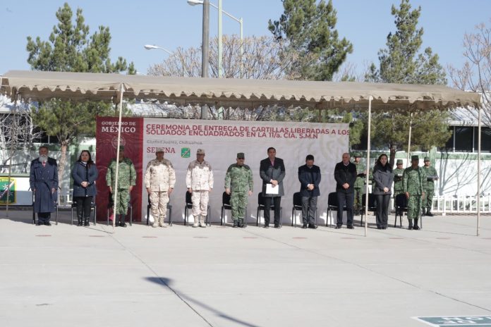Ciudad Juárez, Chih .- Este día se llevó a cabo la ceremonia de entrega de Cartillas Liberadas a los Soldados Encuadrados en la 11 Compañía del Servicio Militar Nacional, tratándose de jóvenes que culminaron su adiestramiento de tres meses en el tercer escalón militar.