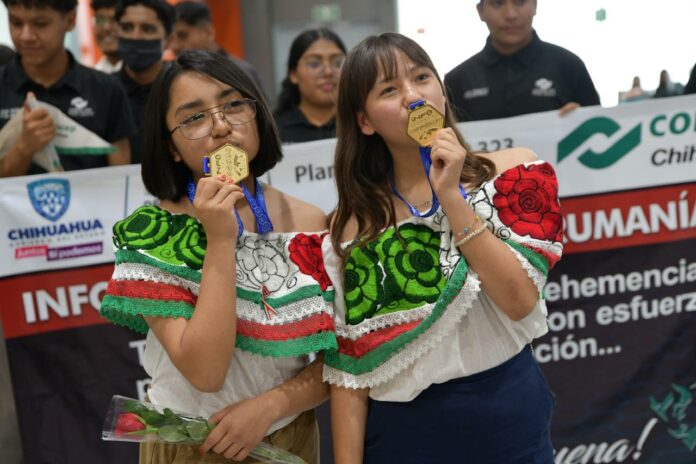 Las alumnas del Colegio Nacional de Educación Profesional Técnica (Conalep) Plantel Juárez III, Alejandra Espinoza González y Gema Vianey Guerrero Minjarez, arribaron al Aeropuerto Internacional Abraham González de Ciudad Juárez, donde fueron recibidas por sus familiares, compañeros, docentes y directivos de este subsistema.