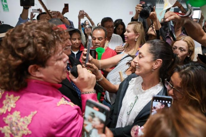 Acompañada de ‘’Capi Noriega y sus Pachucos de Juárez’’, Claudia Sheinbaum se unió a la emoción y al júbilo al aceptar la invitación a bailar entre aplausos y porras.