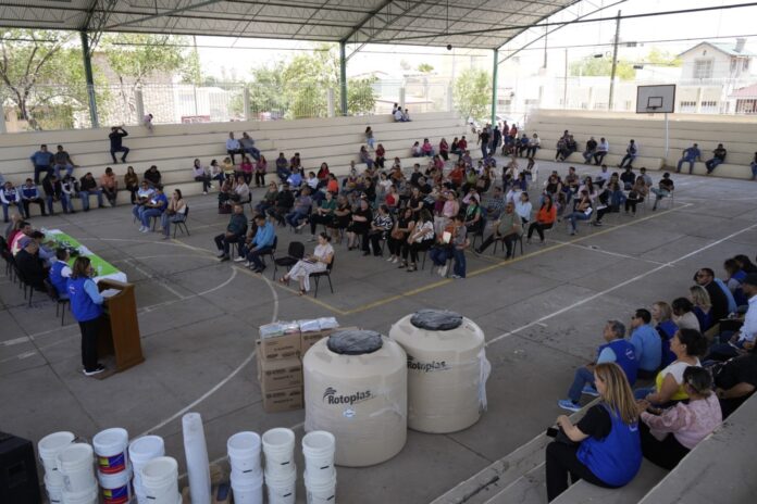 Ciudad Juárez, Chih .- Durante el evento efectuado en la Escuela Primaria Miguel Hidalgo, se otorgaron diversos elementos a 53 centros educativos, incluidas cubetas de pintura, impermeabilizante y membrana de refuerzo, cemento, tinacos, inodoros, entre otros.