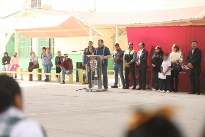 Ciudad Juárez, Chih .- El alcalde habló del enfoque en la administración de seguir apoyando a la comunidad estudiantil, pues destacó que más de 130 domos se han entregado, además de la rehabilitación de más de 500 planteles educativos.