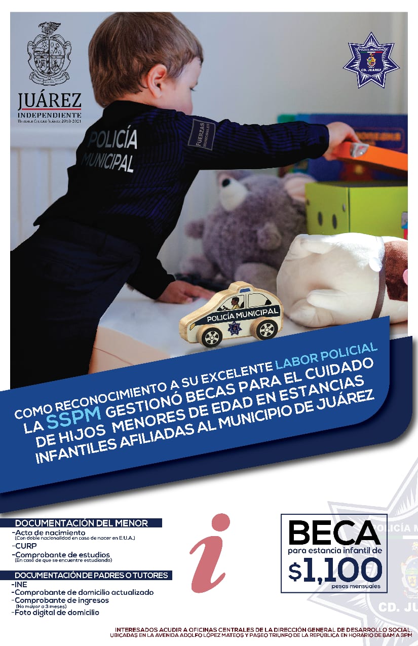 Ciudad Juárez, Chih. – Como reconocimiento a su excelente labor policial, la Secretaría de Seguridad Pública Municipal gestionó becas para estancia infantiles subsidiadas por el Municipio de Juárez a todo el personal operativo y administrativo que tengan hijos de uno a 17 años de edad.
