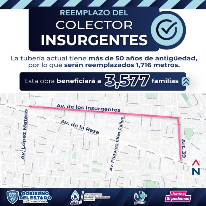 Debido a que la tubería actual tiene más de 50 años de antigüedad y ya cumplió su tiempo de vida útil, la J+ anuncia que en fecha próxima iniciarán las labores para cambiar el colector Insurgentes, obra en la cual se invertirán 21 millones de pesos, solamente en tubería.