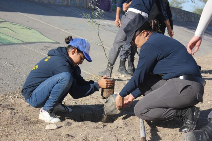 La sargento Maricruz Cruz Hidalgo dijo que acudieron 23 jóvenes del Pentatlón y plantaron 30 árboles mezquite.