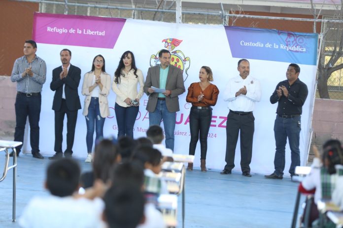 En el evento estuvieron Alejandra Núñez, de la asociación civil Vamos por Juárez; Armando Cota Alvarado, supervisor de la Zona 50; Adriana Enríquez, representante de los padres de familia, así como los regidores Pedro Matus Peña y Jorge Marcial Bueno Quiroz, además de Ismael Rueda Fernández, coordinador de Infraestructura Educativa del Municipio de Juárez.