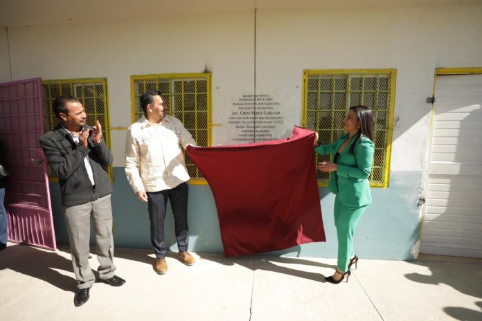 El Presidente Municipal, Cruz Pérez Cuéllar, entregó este día varias obras al Jardín de Niños Barrancas del Cobre, ubicado en Urbi Villa del Prado I, en el sur de la ciudad.