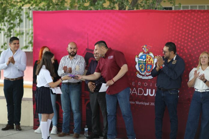 Ciudad Juárez, Chih .- “Me da mucho gusto estar aquí y entregarles está obra, hemos rehabilitado más de 507 escuelas en la actual y pasada administración”, señaló el alcalde, tras agradecer a los presentes por acudir a la ceremonia.