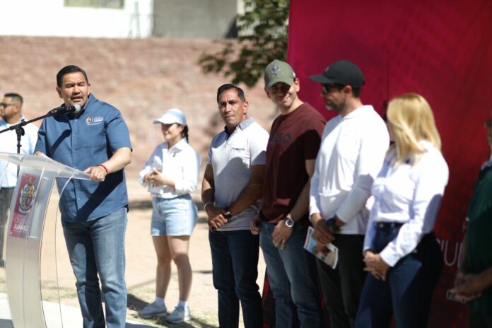 Ciudad Juárez, Chih .- Durante su mensaje, el alcalde destacó la importancia de la colaboración entre ciudadanía y gobierno para la realización de obras públicas.