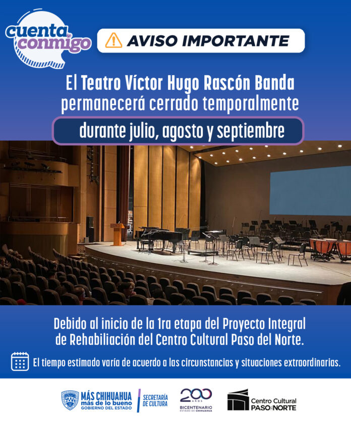 La Secretaría de Cultura ha anunciado que el Teatro “Víctor Hugo Rascón Banda” estará fuera de operaciones durante el mes de julio debido al inicio de trabajos de rehabilitación en su infraestructura.