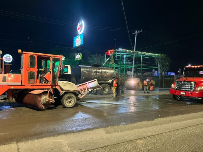 Ciudad Juárez, Chih. (ADN/Staff) – La Dirección General de Obras Públicas lleva a cabo trabajos nocturnos de rehabilitación en el crucero de las avenidas De la Raza y Tecnológico, como parte del programa municipal de Mejoramiento de Vialidades, con el objetivo de optimizar la movilidad y reducir afectaciones al flujo vehicular.