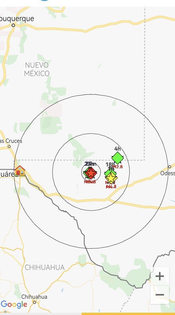 Ciudad Juárez, Chih .- El epicentro de los sismos, de acuerdo al Servicio Geológico de los Estados Unidos, reporta que el primero ocurrió a las 9:01 de la mañana en Toyah, Texas, con una magnitud de 4.4 en la escala de Richter; el segundo ocurrió a las 9:46 de la mañana en Whites City, Nuevo México, con una intensidad de 4.5.