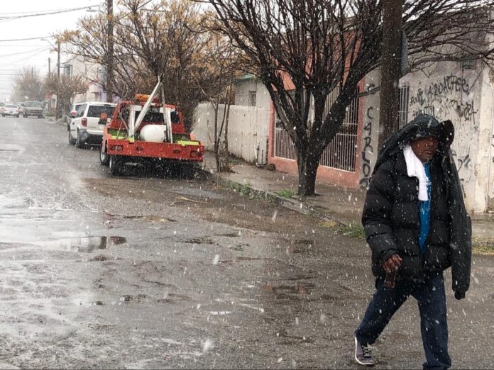Ciudad Juárez, Chih. (ADN / Martín Orquiz) – La precipitación de nieve que se registra en la ciudad, de forma predominante en el norte y poniente, generó que las autoridades municipales de vialidad solicitaran a los automovilistas y peatones precaución durante sus traslados.