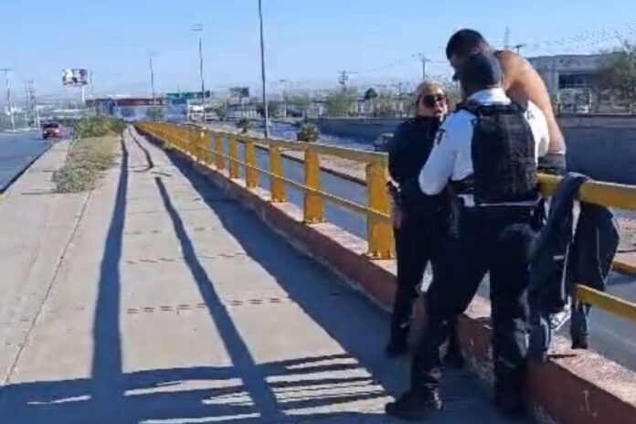 Ciudad Juárez, Chih. (ADN/Staff) – Elementos de la Coordinación General de Seguridad Vial lograron rescatar esta mañana a un hombre que intentaba lanzarse del puente ubicado en el bulevar Independencia y avenida Santiago Troncoso, en el suroriente de la ciudad. La intervención oportuna de los agentes evitó que la situación tuviera un desenlace fatal.