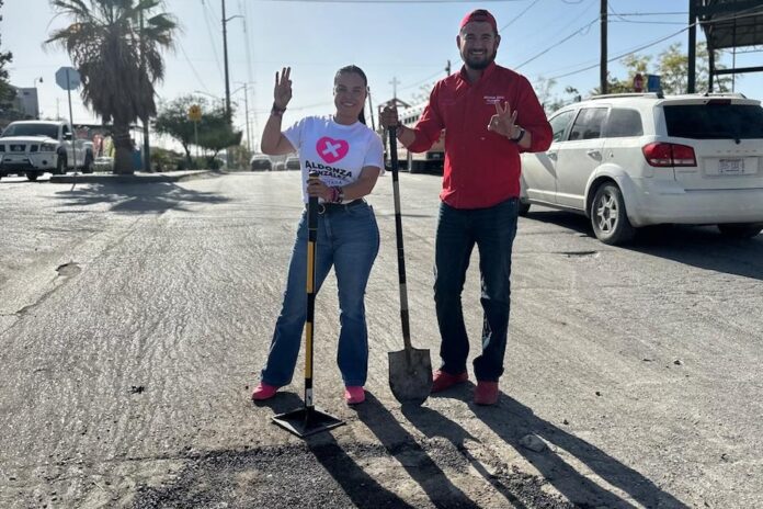 La candidata a diputada local Aldonza González y el candidato a diputado federal Manuel Dick Alarcón, del Frente Amplio por México, respondieron a las demandas ciudadanas y repararon un bache abandonado en Ciudad Juárez.