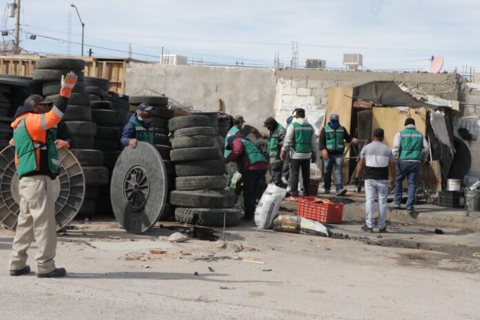 Ciudad Juárez, Chih. (ADN/Staff) – Como parte del programa de Reordenamiento Urbano, el Gobierno Municipal retiró un asentamiento irregular que operaba como llantera, compra de metales y taller mecánico en un predio no autorizado, ubicado en el cruce de Miguel de la Madrid y Manuel de Zequeira, al sur de la ciudad.
