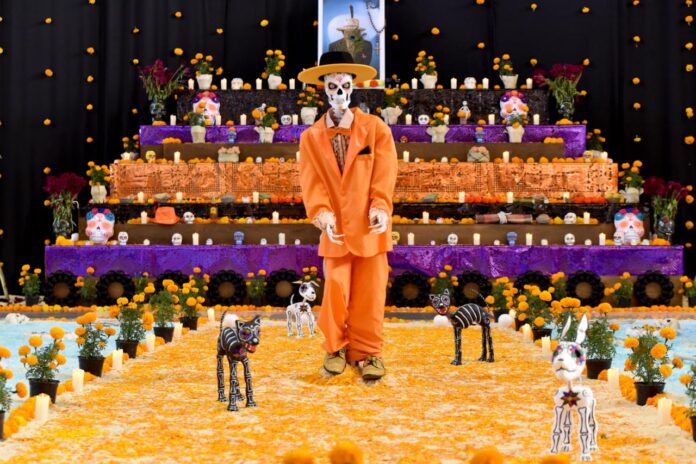 El altar cuenta con todos los elementos tradicionales que caracterizan esta ofrenda, como flores de cempasúchil, veladoras, alimentos típicos, pan de muerto, fotografías, calaveras decoradas y figuras alusivas al personaje, acompañadas del xoloitzcuintle, considerado el guía de las almas en su camino al más allá.