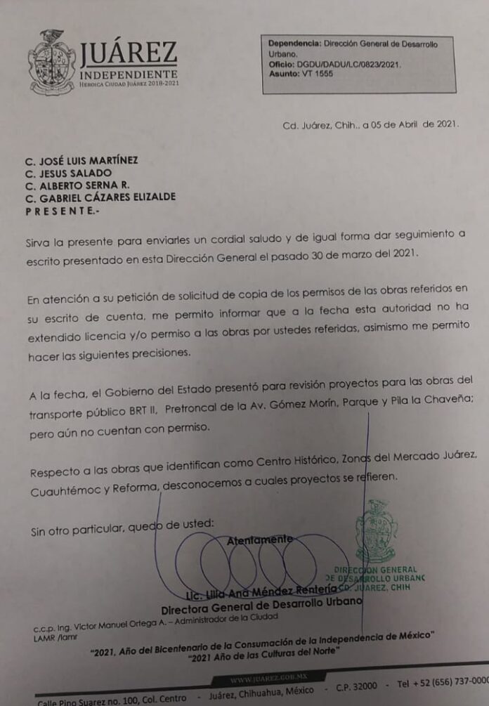 El escrito está firmado por Lilia Ana Méndez Rentería, directora general de Desarrollo Urbano y es dirigido a los ciudadanos José Luis Martínez, Jesús Salado, Alberto Serna y Gabriel Cázares Elizalde.