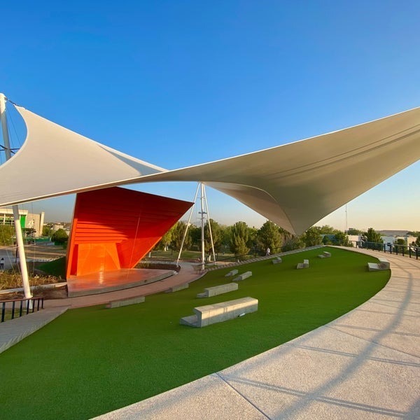 Con una malla sombra velaria de 908.78 metros cuadrados, diseñada con una innovadora estructura de cinco puntas (tres altas y dos bajas), este recinto ofrece una doble curvatura inversa que maximiza la sombra y la comodidad de sus asistentes.