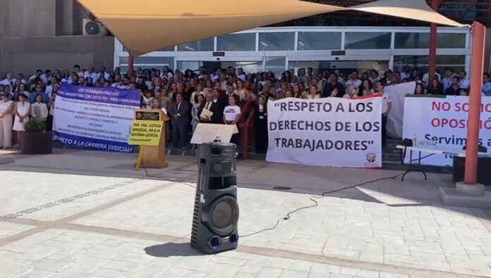 Ciudad Juárez, Chih (ADN/Arturo Hernández) – La mañana de este lunes, los trabajadores de los juzgados federales en Ciudad Juárez se manifestaron al exterior del Poder Judicial, en la avenida Tecnológico.