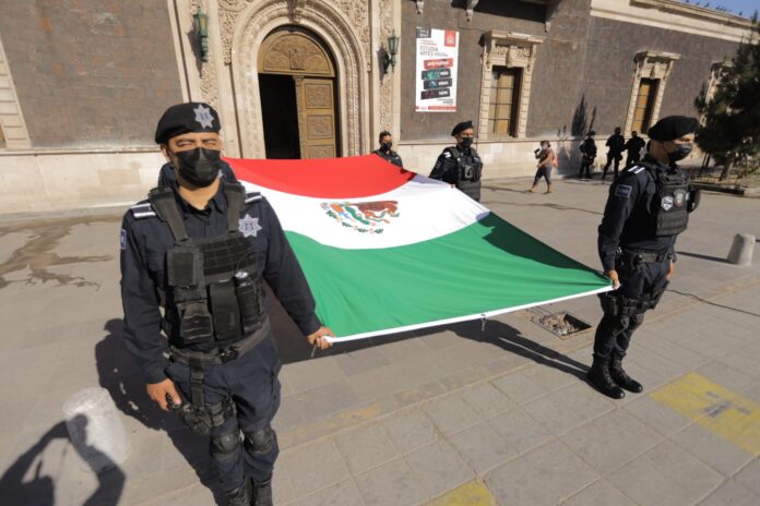 Los integrantes de la escolta y banda de guerra de la Secretaría de Seguridad Pública Municipal (SSPM), fueron los encargados de llevar a cabo los honores a la bandera.