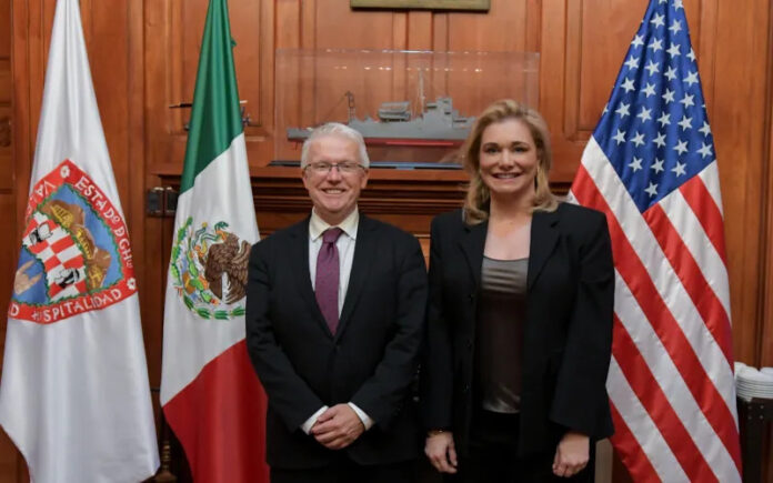 La gobernadora Maru Campos sostuvo una reunión de trabajo con el cónsul general de E.E. U.U en Ciudad Juárez, Rafael Foley, con quien abordó temas relacionados con la seguridad en la región fronteriza.
