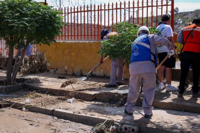Ciudad Juárez, Chih .- Desde temprana hora, cinco camiones de volteo, tres retroexcavadoras y varias cuadrillas, trabajan para devolver la tranquilidad a las familias, limpiando los accesos, retirando desechos, llevándose los tiliches y despejando líneas afectadas.