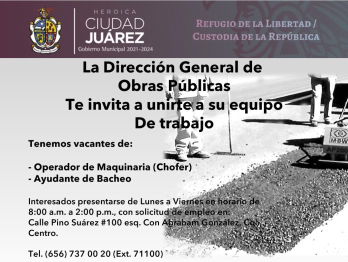 Ciudad Juárez, Chih .- El director general de Obras Públicas, Daniel González García, comentó que actualmente se tienen vacantes de operador de maquinaria (Chofer) y ayudante de bacheo.