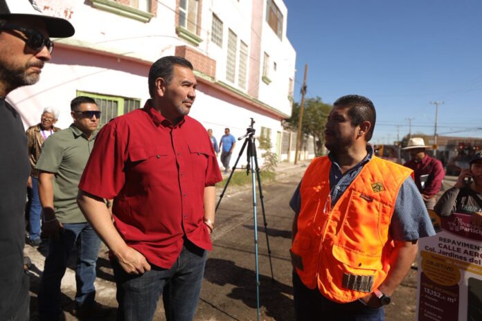 Este mediodía el Presidente Municipal, Cruz Pérez Cuéllar, acudió a supervisar los trabajos de recarpeteo que se llevan a cabo en la calle Aeromoza de la colonia Jardines del Aeropuerto.